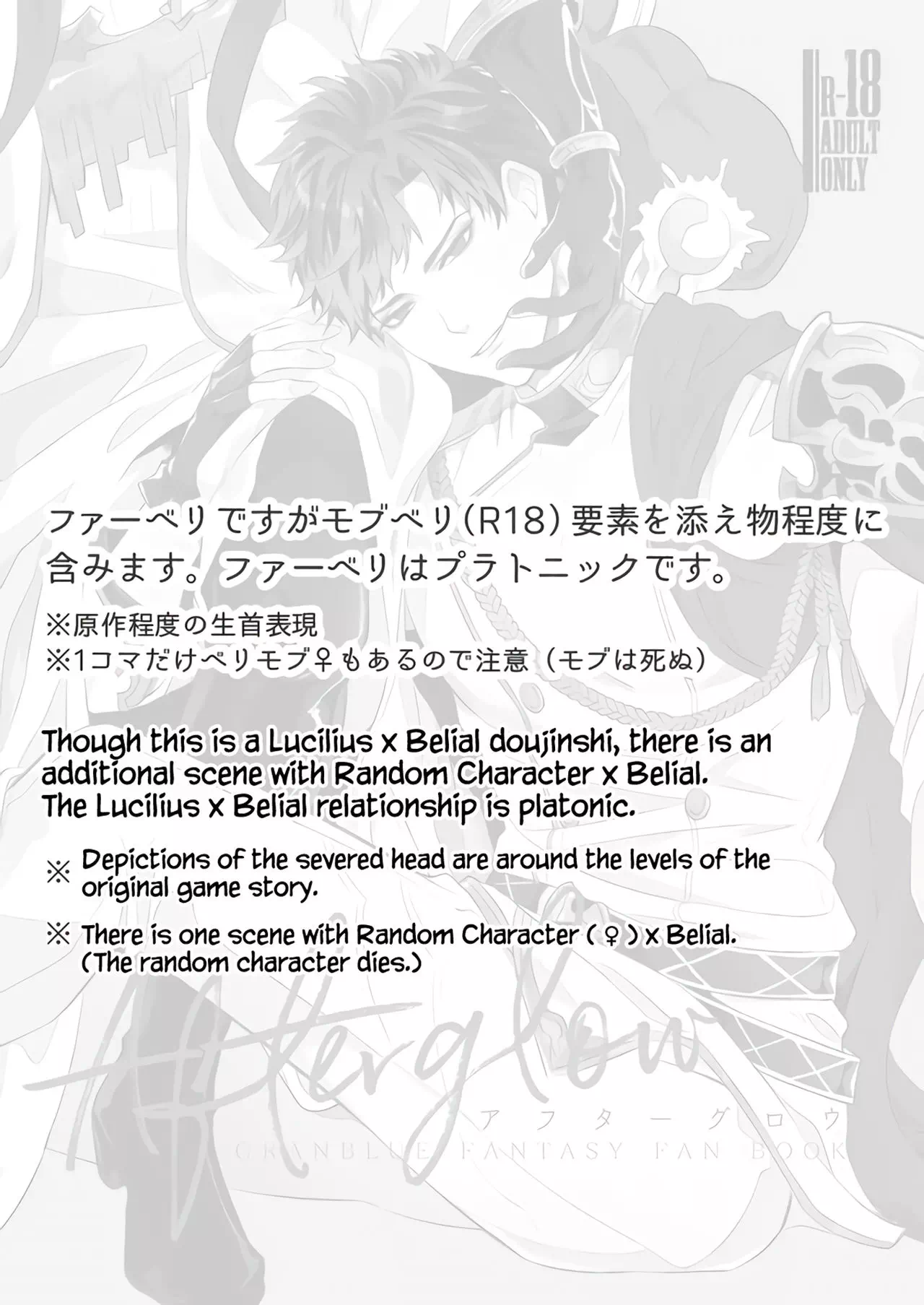 Though this is a Lucilius x Belial doujinshi, there is an additional scene with Random Character x Belial. The Lucilius x Belial relationship is platonic.